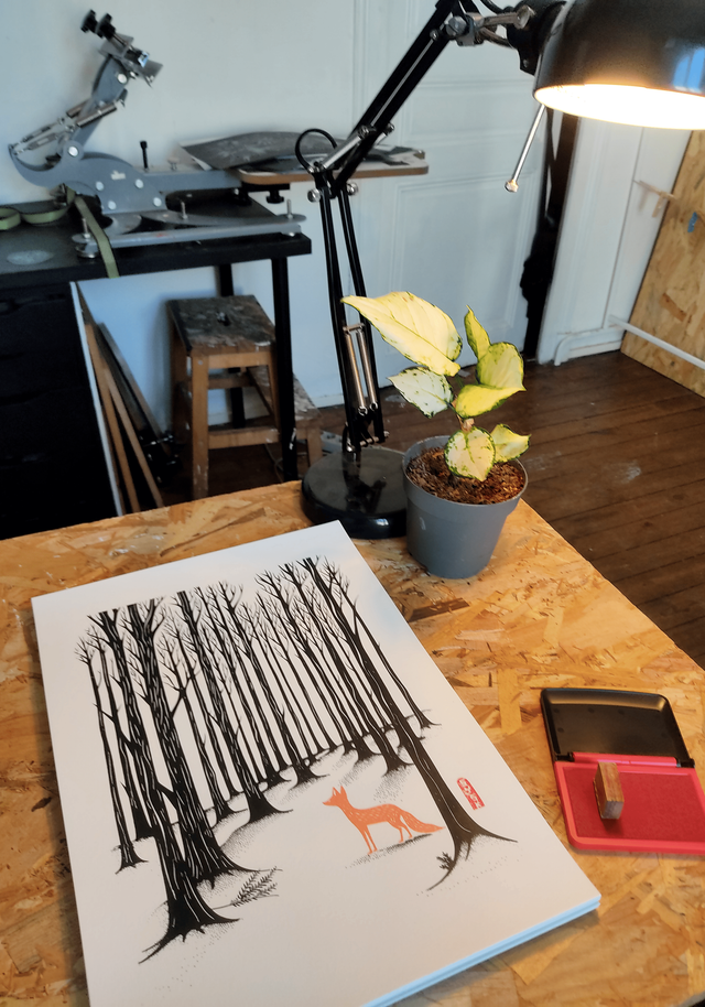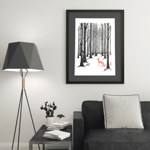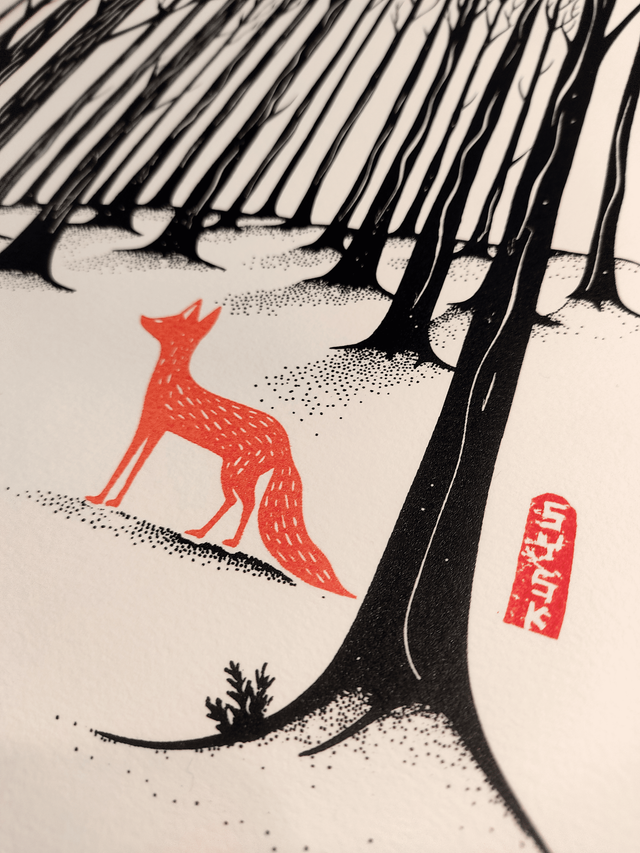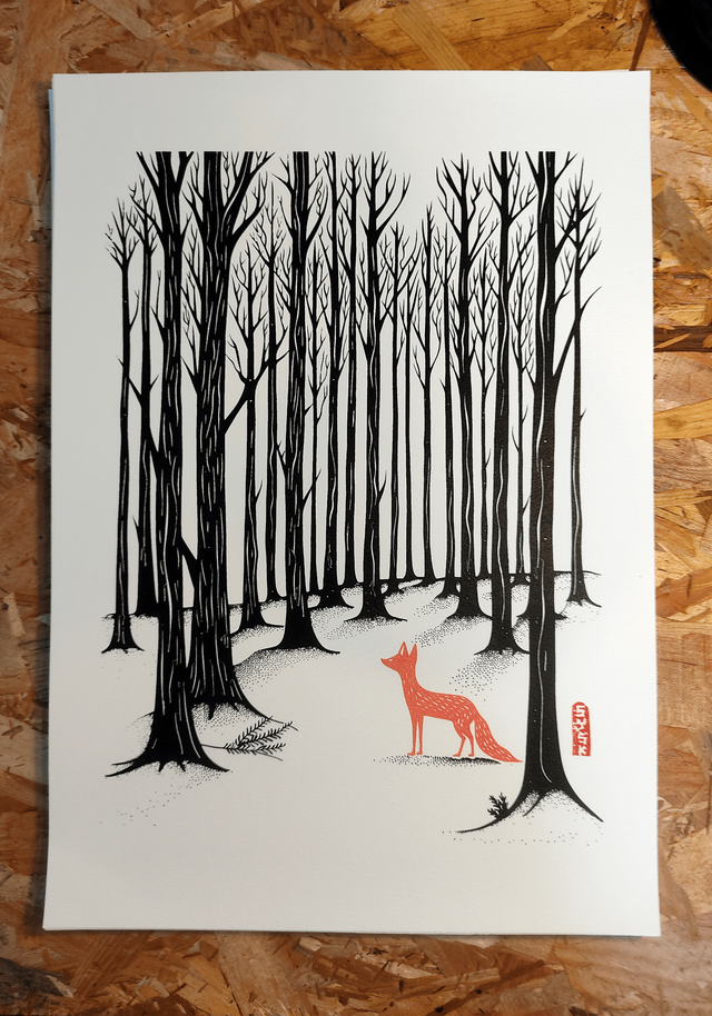 Cette sérigraphie met en scène un renard solitaire perdu au milieu d'une forêt hivernale, dans une composition à la fois poétique et élégante.